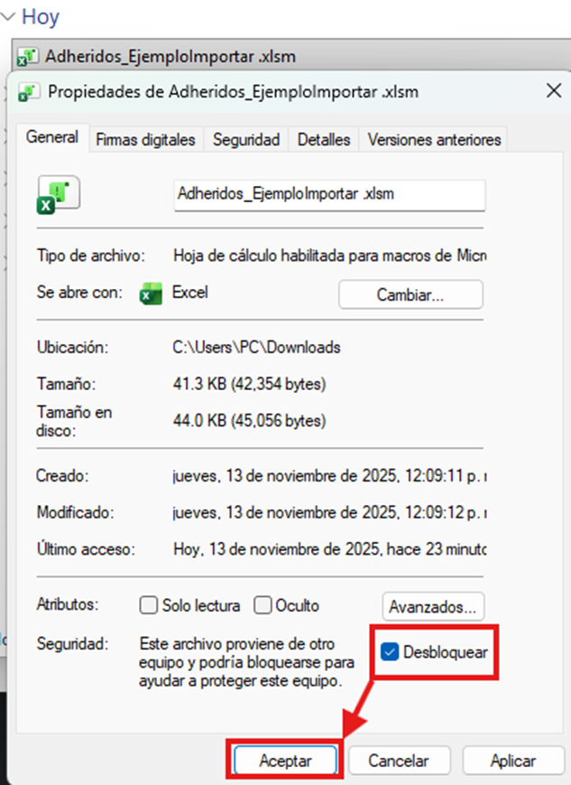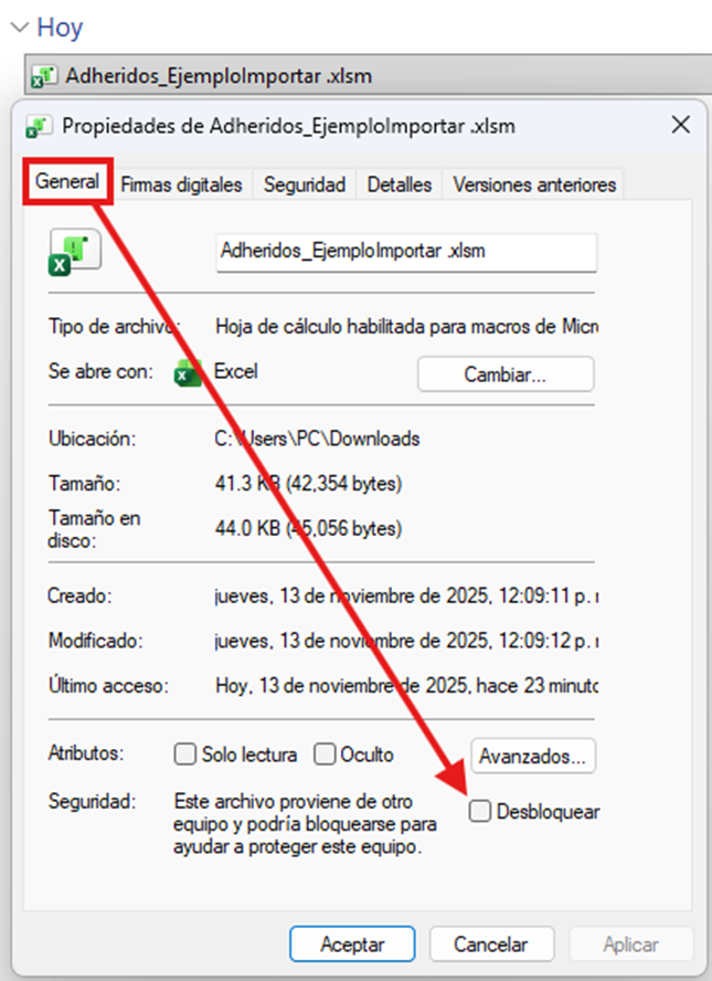 2. En la pestaña “General”, habilitar la casilla “Desbloquear” en la parte inferior derecha de la ventana de Propiedades del archivo, para luego aceptar la configuración.