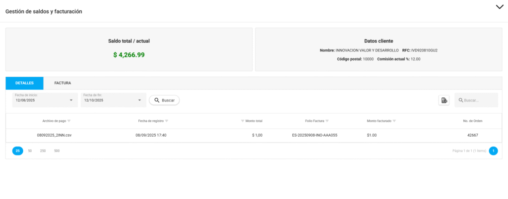 En la pestaña “Detalles” del submódulo de saldos puedes consultar un historial completo de los archivos de pago cargados al sistema, junto con su estatus de facturación y relación con saldos.